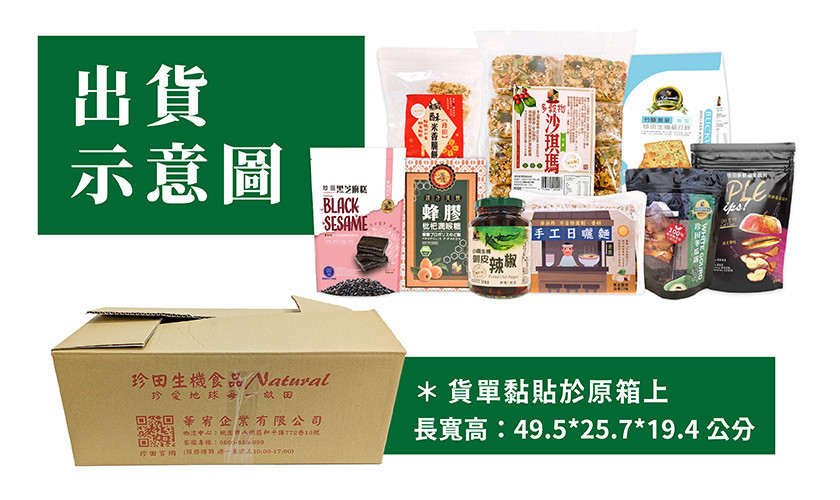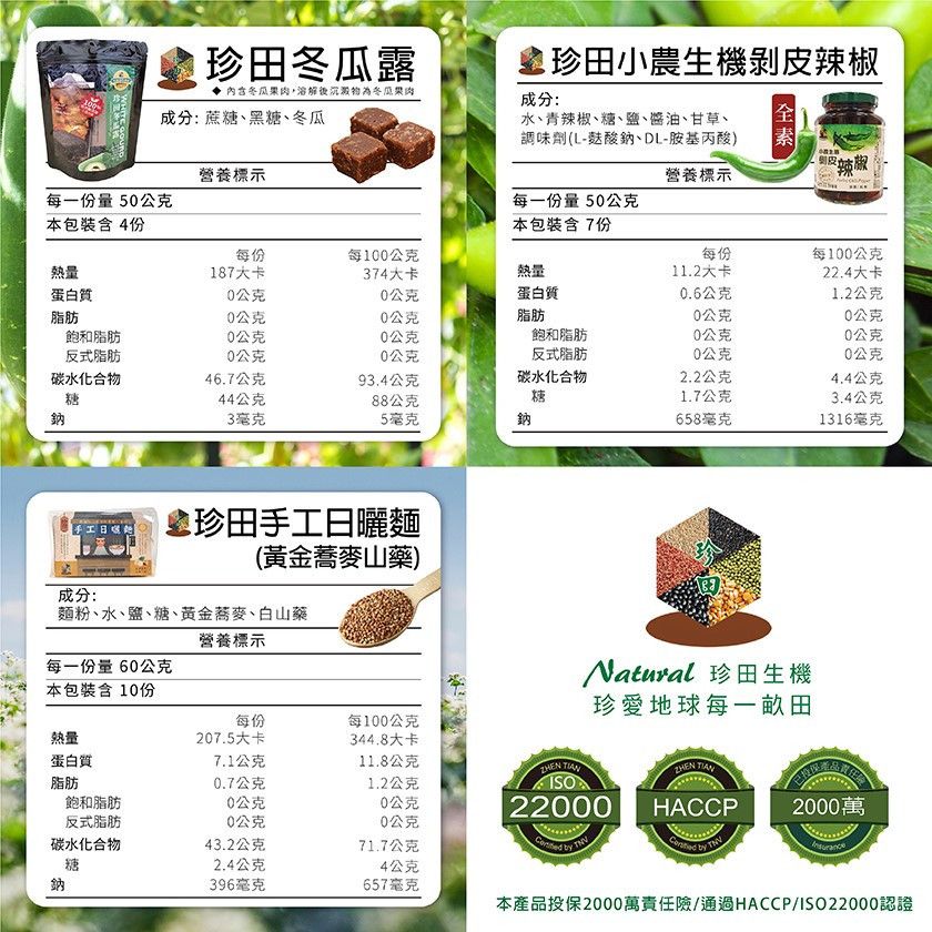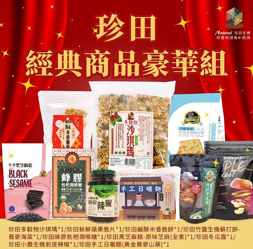 內容物:多穀物沙琪瑪*1+新鮮蘋果脆片*1+鹹酥米香脆餅*1+竹鹽生機蘇打餅(蕎麥海菜)*1+蜂膠枇杷潤喉糖*1+黑芝麻糕(原味)*1+冬瓜露*1+剝皮辣椒*1+黃金蕎麥山藥麵*1