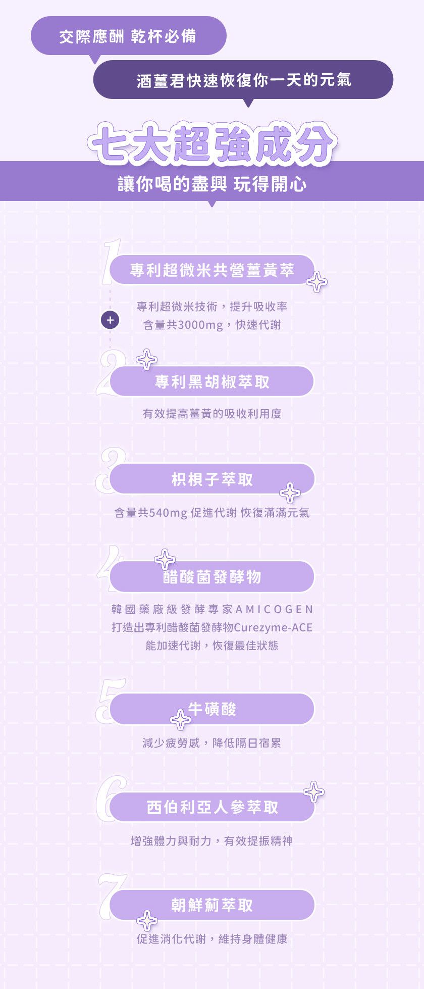 成分:水、薑黃萃取(水、赤藻糖醇、薑黃萃取、玉米糖膠、大豆(非基因改造)卵磷脂)、蔗糖、枳梖子萃取(枳梖子萃取、玉米糊精)、牛磺酸、紅葡萄濃縮汁、綜合膠體(鹿角菜膠(鹿角菜膠、葡萄糖)、刺槐豆膠、蒟蒻粉、氯化鉀、玉米糖膠)、西伯利亞人蔘萃取(西伯利亞人蔘萃取、麥芽糊精)、朝鮮薊萃取(朝鮮薊萃取、麥芽糊精)、檸檬酸鈉、檸檬酸、香料(丙二醇、乙醇(酒精)、水、香料)、香料(丙二醇、乙醇、香料)、DL-蘋果酸、醋酸菌發酵物(醋酸菌發酵物(Acetobacter pasteurianus)、麥芽糊精、葡萄糖)、蔗糖素(甜味劑)、塔拉膠、結蘭膠、黑胡椒精華