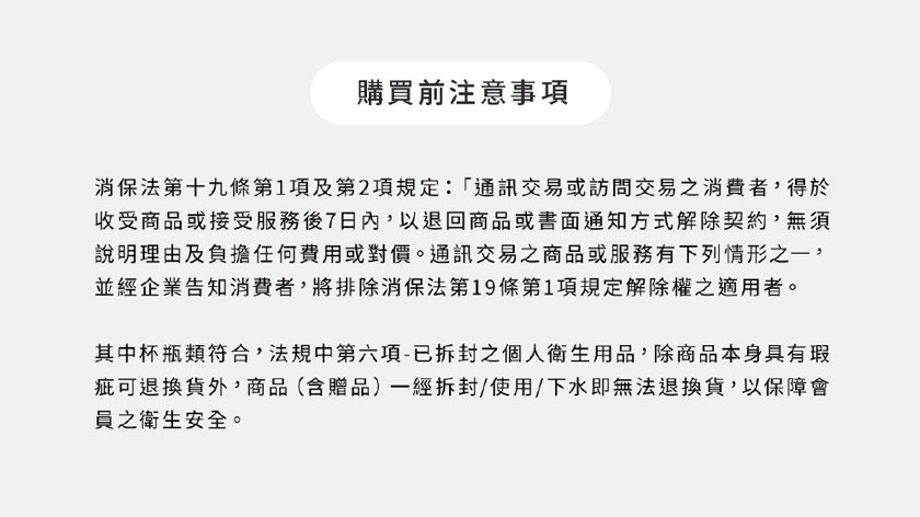 保固內容:杯瓶類符合,法規中第六項已拆封之個人衛生用品,除商品本身具有瑕疵可退換貨外,商品(含贈品)一經拆封/使用/下水即無法退換貨,以保障衛生安全