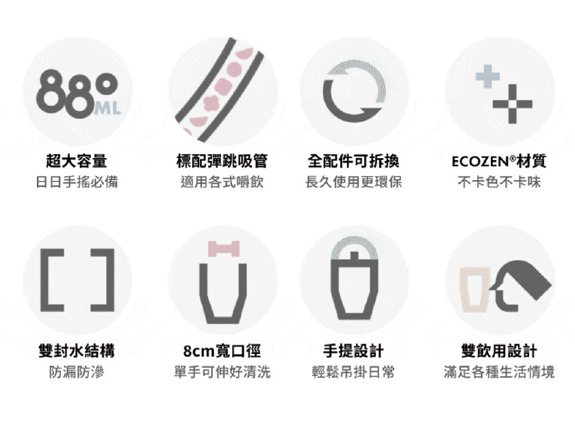 材質/成分:瓶身-ECOZEN®(食品耐熱90°C)、上蓋-PP(食品耐熱120°C) 、密封圈-矽膠(食品級耐熱190°C) 、彈跳粗吸管-Tritan(食品耐熱100°C) 、矽膠-(食品耐熱190°C)