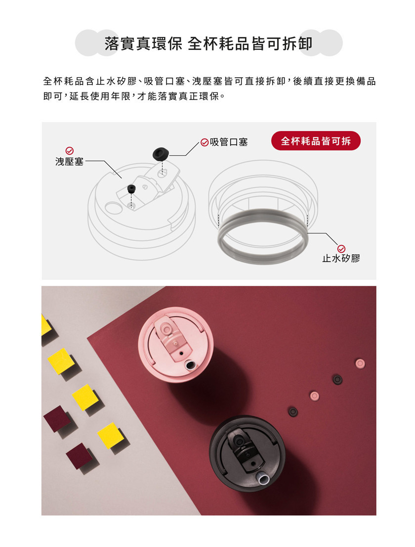 止水矽膠塞:於杯蓋正面位置,附有可拆卸止水矽膠塞,請由杯蓋背面輕拉拔出清潔。安裝時,請將尖端朝下,由杯蓋正面輕壓,確認矽膠塞貼合杯蓋,即完成安裝