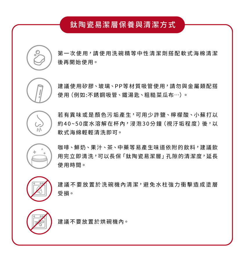 1.請使用軟式海綿、中性清潔劑搭配刷洗,以保持杯內鈦陶瓷/雙層陶瓷易潔層完整