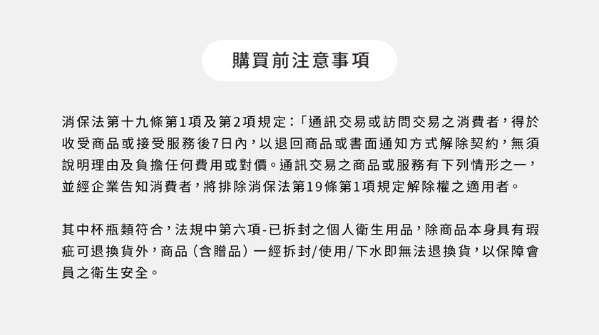 保固內容:杯瓶類符合,法規中第六項已拆封之個人衛生用品,除商品本身具有瑕疵可退換貨外,商品(含贈品)一經拆封/使用/下水即無法退換貨,以保障衛生安全