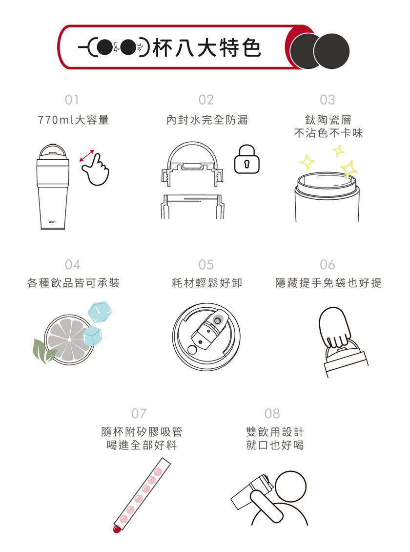 3.雙層真空及鈦陶瓷 / 雙層陶瓷易潔層設計不易感受杯中溫度,熱水會造成壓力差,請勿盛裝超過60°C以上滾水或是超過8成的水量,以免飲用時燙傷或出