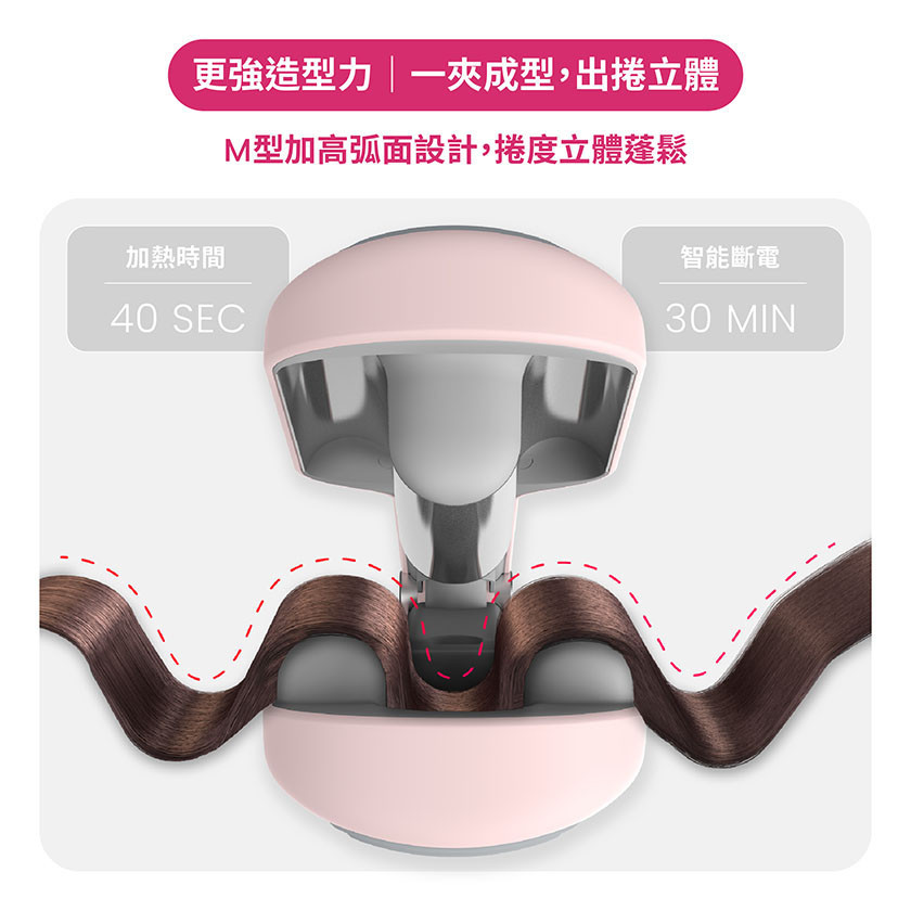 -造型力升級,一夾成型,出捲立體,M型加高弧面設計,捲度立體蓬鬆