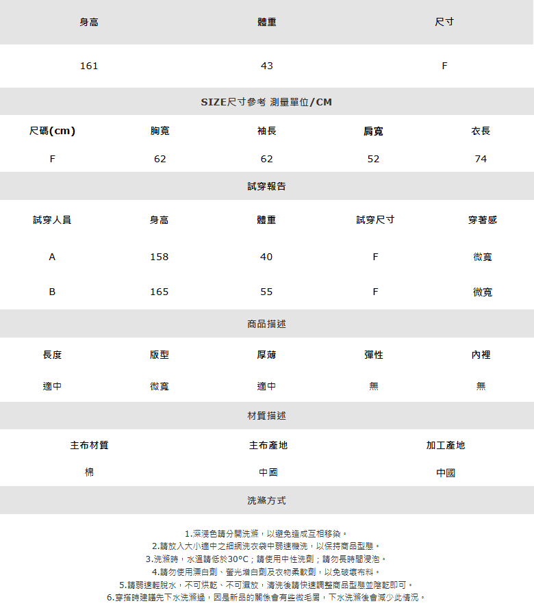 7.服飾洗滌後,縮水5%以內為合理範圍。