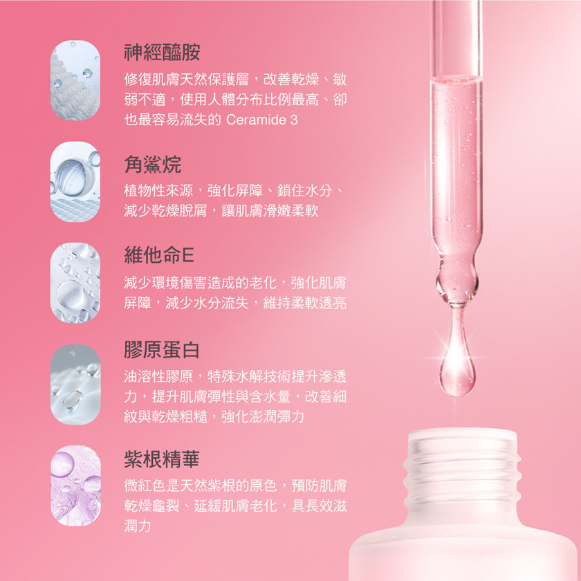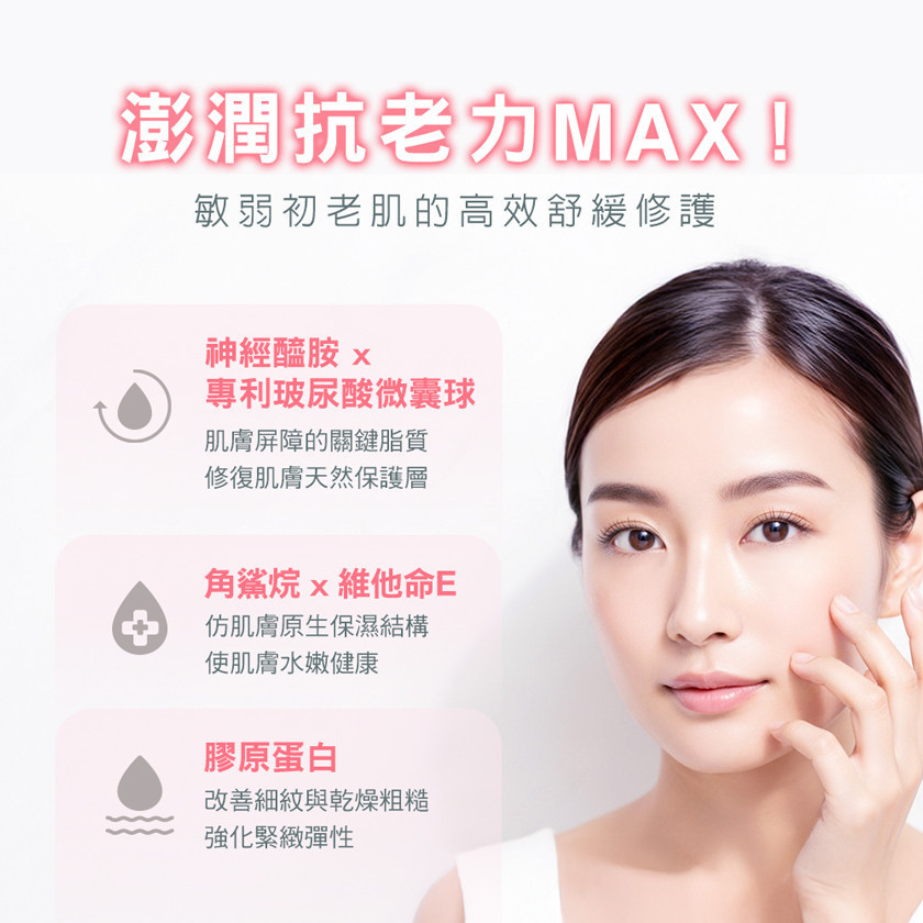 成分:神經醯胺、角鯊烷、維他命E、膠原蛋白、專利玻尿酸微囊球等。全成分詳見產品包裝標示