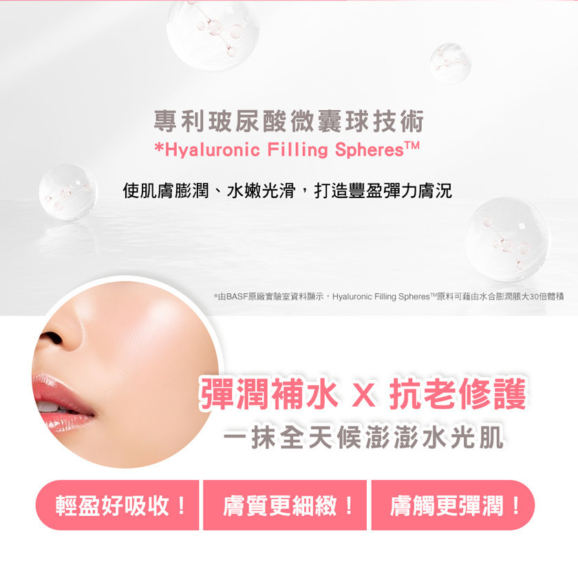 -膠原蛋白、專利玻尿酸微囊球,澎潤緊緻肌膚