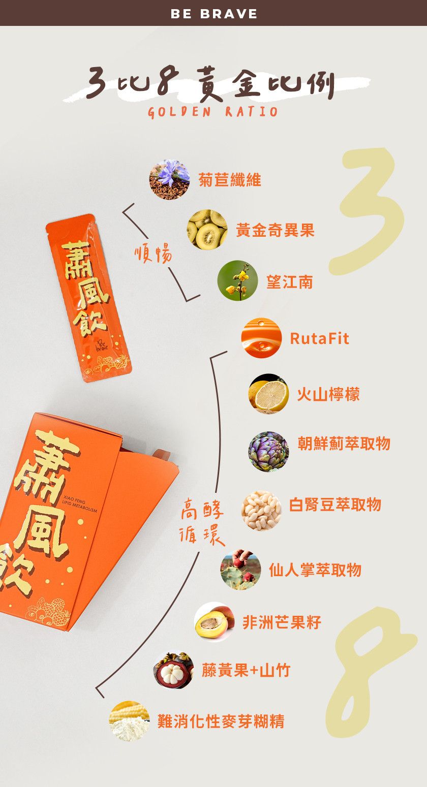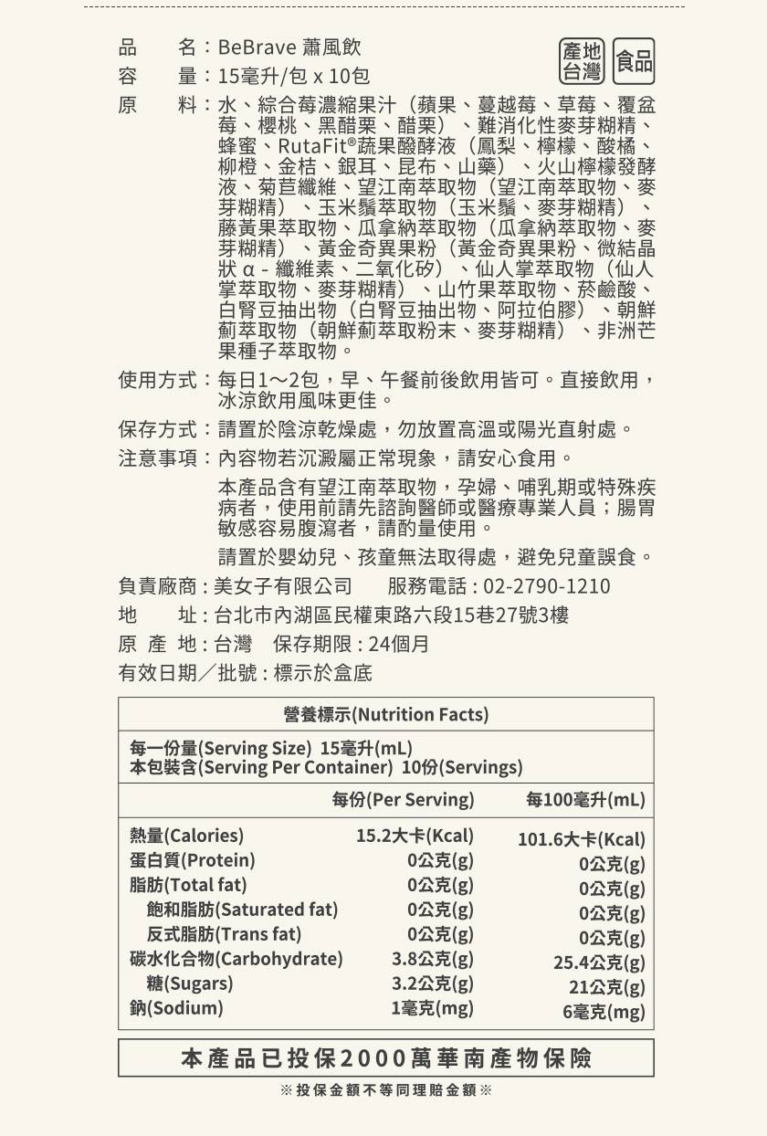 成分:水、綜合莓濃縮果汁(蘋果、蔓越莓、草莓、覆盆莓、櫻桃、黑醋栗、醋栗)、難消化性麥芽糊精、蜂蜜、RutaFit®蔬果醱酵液 (鳳梨、檸檬、酸橘、柳橙、金桔、銀耳、昆布、山藥)、火山檸檬發酵液、菊苣纖維、望江南萃取物(望江南萃取物、麥芽糊精)、玉米鬚萃取物(玉米鬚、麥芽糊精)、藤黃果萃取物、瓜拿納萃取物(瓜拿納萃取物、麥芽糊精)、黃金奇異果粉(黃金奇異果粉、微結晶狀α-纖維素、二氧化矽)、仙人掌萃取物(仙人掌萃取物、麥芽糊精)、山竹果萃取物、菸鹼酸、白腎豆抽出物(白腎豆抽出物、阿拉伯膠)、朝鮮薊萃取物(朝鮮薊萃取粉末、麥芽糊精)、非洲芒果種子萃取物