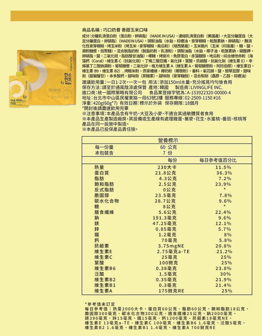 成分:分離乳清蛋白粉(蛋白粉,卵磷脂)(MADE IN USA),濃縮乳清蛋白粉(美國產),調製油脂(水飴,棕櫚油,麥芽糊精,乾酪素鈉,卵磷脂),難消化性麥芽糊精,地瓜濃縮粉(縮紅薯,混合製劑(酒精,純淨水,丙二醇,香料,天然香料),梔子黃,大豆分離蛋白(大豆分離蛋白,卵磷脂)(MADE IN USA),紅薯蛋白球,香蕉片,魚膠蛋白,椰糖,地瓜粉(韓國產紅薯),混合脫脂奶粉(脫脂奶粉,乳清粉)紐西蘭產,調製油脂(水飴,椰子油,乾酪素鈉,磷酸鉀,卵磷脂,鹽,二氧化矽,脂肪酸甘油酯),香料,綜合維他命粉{海𤂋鈣(coral),維生素C(抗氧化劑),丁烯二酸亞鐵,氧化鋅,葉酸,菸鹼酸,抗氧化劑(維生素E),辛烯基丁一酸鈉澱粉,葡萄糖漿,二氧化矽,複方維生素A(維生素A,葡萄糖漿粉,阿拉伯膠),維生素B1,維生素B6,維生素B2},烤糙米粉,燕麥纖維,椰奶粉(椰漿粉),氧化鎂,鹽,關華豆膠,甜味劑(甜菊醣苷),本多酸鈣,甜味劑(蔗糖素),甜味劑(麥芽糖醇),混合製劑(蟲膠,乙醇,棕櫚油)