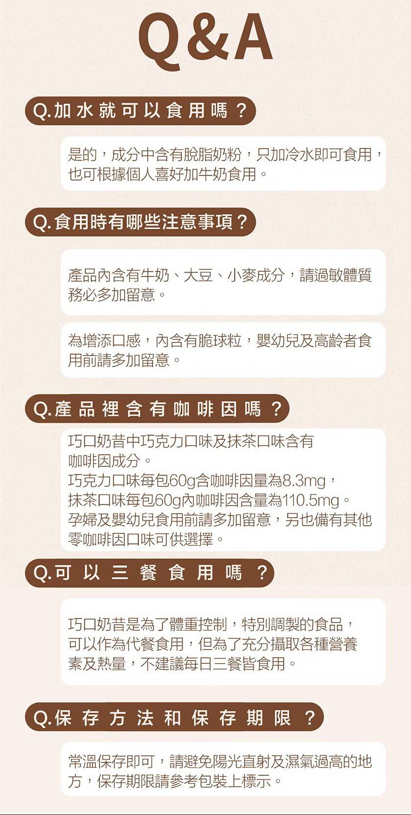 9.巧克力、抹茶口味含有咖啡因,因此孕婦、哺乳期婦女或對咖啡因敏感者應斟酌食用