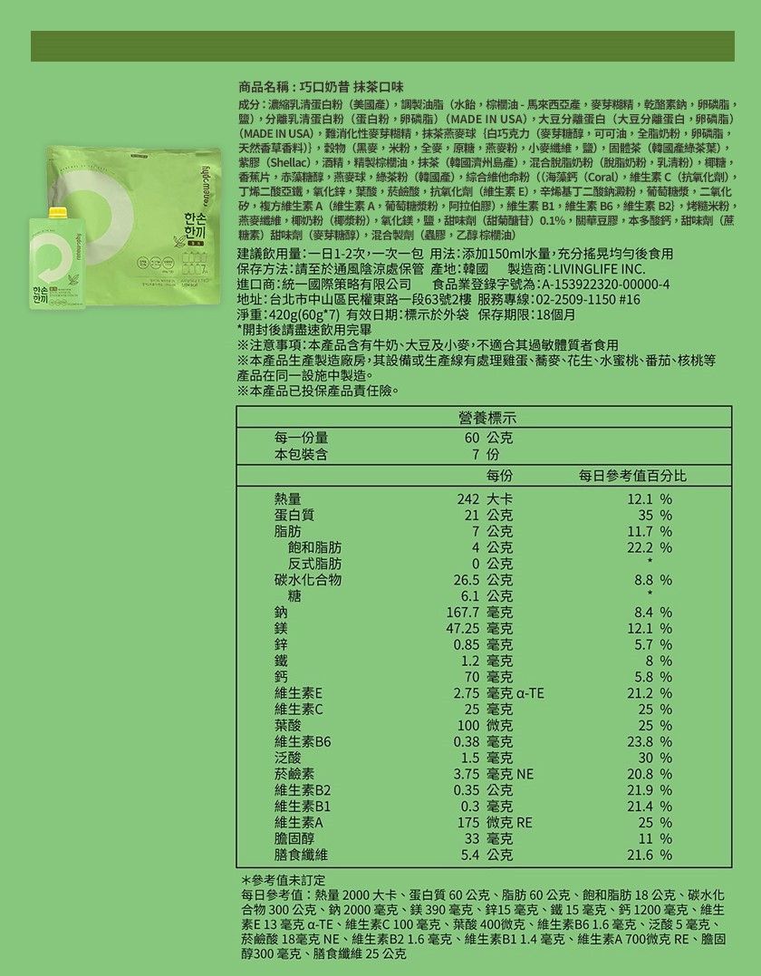 成分:濃縮乳清蛋白粉(美國產),調製油脂(水飴,棕櫚油-馬來西亞產,麥芽糊精,乾酪素鈉,卵磷脂,鹽),分離乳清蛋白粉(蛋白粉,卵磷脂)(MADE IN USA),大豆分離蛋白(大豆分離蛋白,卵磷脂)(MADEIN USA),難消化性麥芽糊精,抹茶燕麥球{白巧克力(麥芽糖醇,可可油,全脂奶粉,卵磷脂,天然香草香料)},穀物(黑麥,米粉,全麥,原糖,燕麥粉,小麥纖維,鹽),固體茶(韓國產綠茶葉),紫膠(Shellac),酒精,精製棕櫚油,抹茶(韓國濟州島產),混合脫脂奶粉(脫脂奶粉,乳清粉),椰糖,香蕉片,赤藻糖醇,燕麥球,綠茶粉(韓國產),綜合維他命粉((海藻鈣(Coral),維生素C(抗氧化劑),丁烯二酸亞鐵,氧化鋅,葉酸,菸鹼酸,抗氧化劑(維生素E),辛烯基丁二酸鈉澱粉,葡萄糖漿,二氧化矽,複方維生素A(維生素A,葡萄糖漿粉,阿拉伯膠),維生素B1,維生素B6,維生素B2},烤糙米粉,燕麥纖維,椰奶粉(椰漿粉),氧化鎂,鹽,甜味劑(甜菊醣苷)0.1%,關華豆膠,本多酸鈣,甜味劑(蔗糖素)甜味劑(麥芽糖醇),混合製劑(蟲膠,乙醇 棕櫚油)